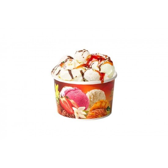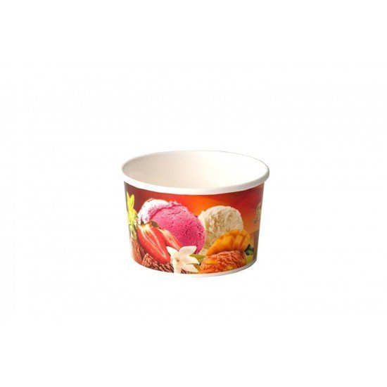230cc hacimli, ağız çapı 9 cm, yüksekliği 5,5 cm ebatlarında, dondurma desenli tek kullanımlık karton dondurma kasesidir.